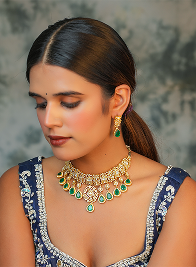 This luxurious necklace set features an intricate gold design accented by dazzling green gemstone drops, creating an exquisite blend of elegance and opulence. The necklace is complemented by matching earrings that carry the same intricate detailing and vibrant green stones, adding harmony and sophistication to the set. Perfect for weddings, festive celebrations, and grand occasions, this set exudes timeless beauty and regal charm. Its meticulous craftsmanship and striking color combination make it a show-stopping accessory that enhances any traditional attire with grace and distinction.