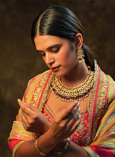 This elegant jewelry set features a beautifully layered necklace adorned with intricate detailing and a blend of traditional and modern design elements. The necklace is paired with matching drop earrings that enhance its regal and sophisticated look. Perfect for weddings, festive celebrations, and grand occasions, this set embodies a luxurious appeal and refined craftsmanship. The subtle use of gemstone accents adds a touch of color and sparkle, making it a standout accessory for those who appreciate timeless beauty and elegance.