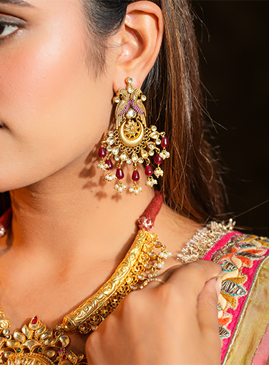 This heritage jewelry set exudes timeless elegance and traditional charm. Featuring a magnificent gold necklace with intricate patterns and classic motifs, it captures the essence of age-old craftsmanship. The matching earrings enhance the set's luxurious feel, showcasing meticulous detailing that complements the necklace perfectly. Ideal for weddings, cultural festivities, and grand occasions, this set celebrates heritage and opulence, allowing the wearer to embody grace and sophistication. The rich design reflects the legacy of tradition, making it a prized addition to any bridal or festive wardrobe.
