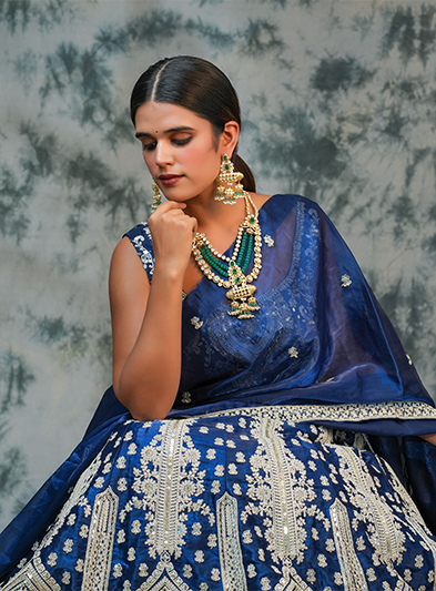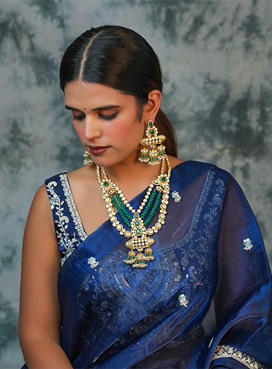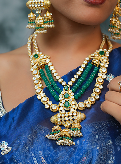 The Emerald Symphony Moissanite Necklace is a breathtaking fusion of luxury and tradition. Featuring multiple strands of vibrant green emerald beads intertwined with moissanite-encrusted gold detailing, this necklace exudes elegance and sophistication. The central pendant and matching earrings showcase intricate craftsmanship and delicate embellishments, enhancing the overall grandeur of the set. Perfect for weddings, grand celebrations, and cultural festivities, this piece captures attention with its bold color contrast and timeless design. The Emerald Symphony Moissanite Necklace is a statement of opulence, making any ensemble radiate with unmatched grace and beauty.