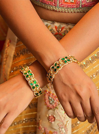 These striking gold bangles are adorned with vibrant green stones, showcasing an intricate design that blends tradition with modern flair. The detailed craftsmanship and bold accents make them the perfect accessory for festive events and cultural celebrations. Ideal for pairing with traditional attire, these bangles add an eye-catching and elegant touch