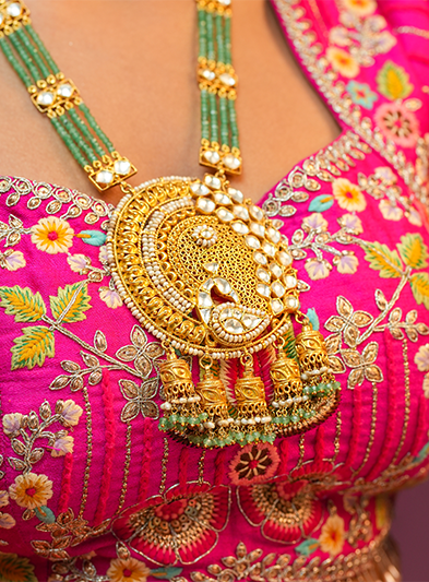 This stunning necklace features an intricately designed gold pendant, adorned with exquisite detailing that reflects traditional artistry. The pendant is complemented by vibrant green beads that add a touch of color and elegance, enhancing the overall appeal of the piece. Perfect for festive occasions, weddings, and cultural celebrations, this necklace embodies a blend of classic charm and regal sophistication. The meticulous craftsmanship and ornate motifs make it a standout accessory that elevates any traditional attire, showcasing the wearer's refined taste and appreciation for heritage jewelry.