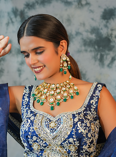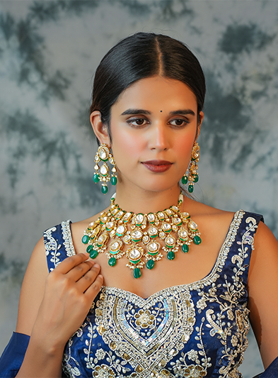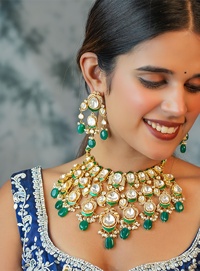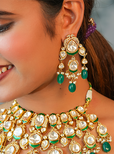 This luxurious bridal jewelry set showcases an opulent design, featuring a stunning necklace adorned with shimmering uncut diamonds and vibrant green accents that enhance its regal appeal. The matching earrings echo the same intricate craftsmanship, highlighted by beautiful green drops that add movement and elegance. Perfect for brides who seek a blend of traditional beauty and contemporary elegance, this set is ideal for weddings and grand occasions. Its dazzling combination of gold and gemstone details ensures that the bride radiates sophistication and grace on her special day.
