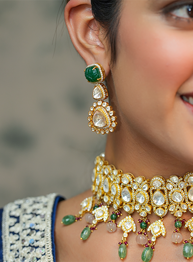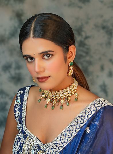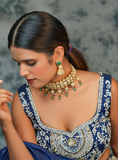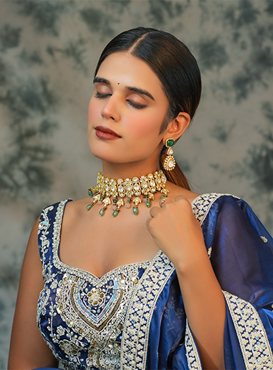 The Royal Roots choker is a magnificent piece that beautifully encapsulates traditional elegance and luxurious charm. This choker is adorned with intricate gold detailing and studded with dazzling Kundan stones, accented by delicate green bead drops that add a touch of vibrancy. The matching earrings echo the same opulent design, creating a harmonious and regal look. Perfect for weddings, formal celebrations, and grand cultural events, the Royal Roots set exudes sophistication and heritage, making it an ideal choice for those who wish to celebrate tradition with an elevated sense of style.